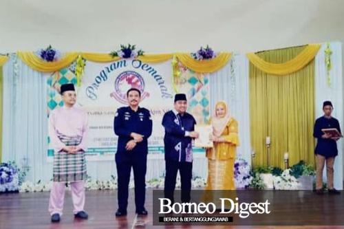 KETUA Bahagian Parti Pribumi Bersatu Malaysia ( BERSATU) Lahad Datu Abdul Hakim Gulam Hassan menyampaikan sijil kepada Suraya Salipun, seorang pemenang gerai paling ceria sempena Program Semarak ESSCOM bersama Warga mukim Silam di Sekolah Kebangsaan (SK) Silam Lahad Datu pada Sabtu.