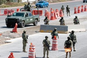 Anggota tentera Mexico berkawal di laluan masuk ke Lapangan Terbang Antarabangsa Guadalajara selepas operasi yang mengorbankan ketua kartel Jalisco New Generation, Nemesio Oseguera atau “El Mencho”, di Jalisco, Mexico. – Foto AFP